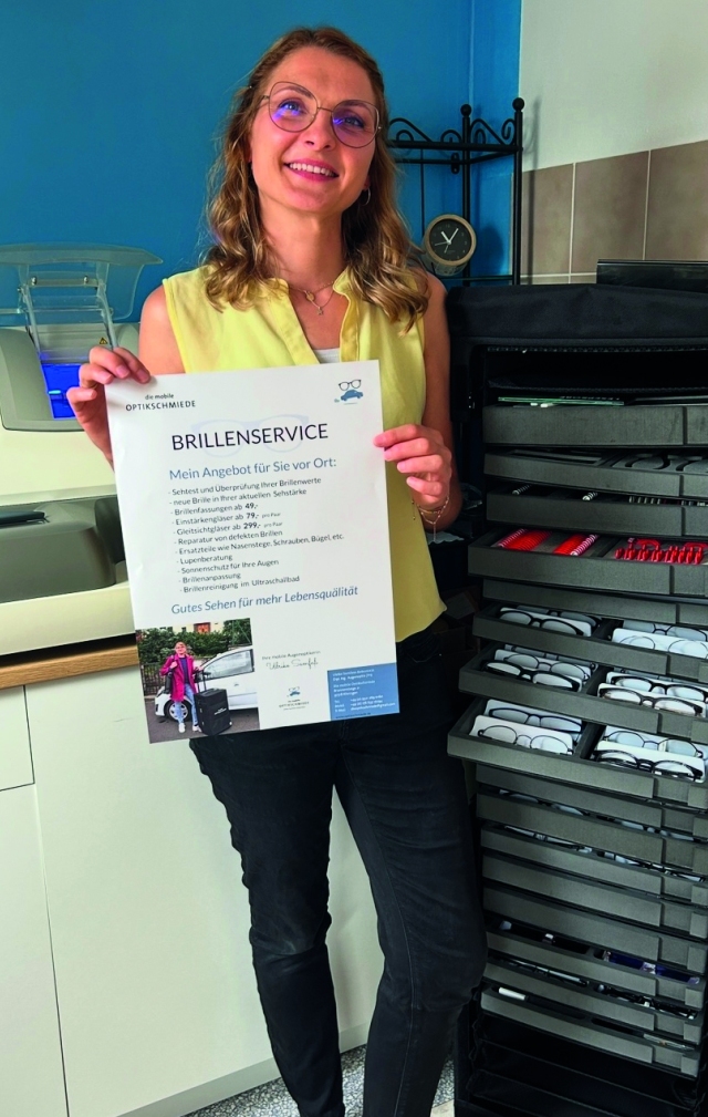gemacht. Im Oktober 2023 begrüßte sie ihre erste Kundin mit einer neuen Brille. Seitdem bietet die Kitzingerin ihren mobilen Service in Kitzingen und Umgebung an.